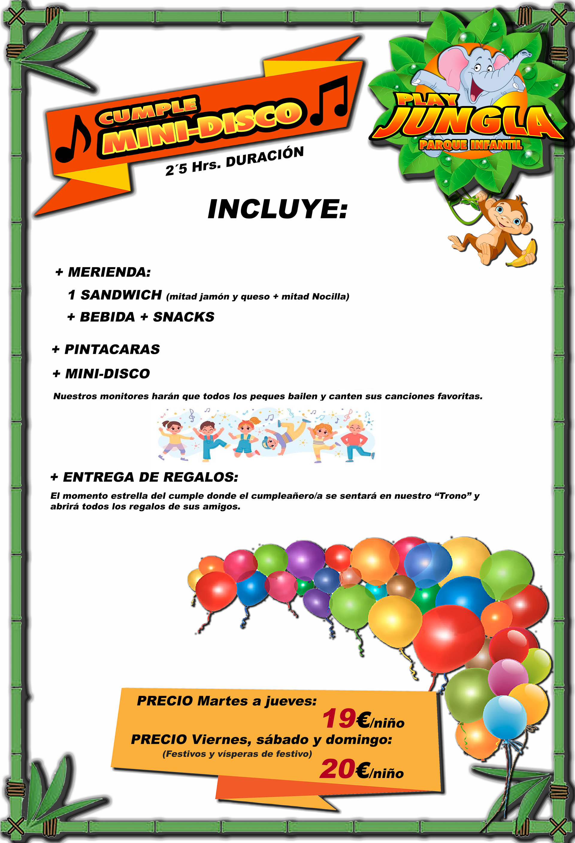 Nuestro cumpleaños más demandado y más completo, con 2,5 horas de duración, donde los peques, a parte de jugar y merendar, tendrán una mini-disco donde podrán bailar y cantar sus canciones favoritas acompañados de nuestros monitores con los que se lo pasarán en grande.